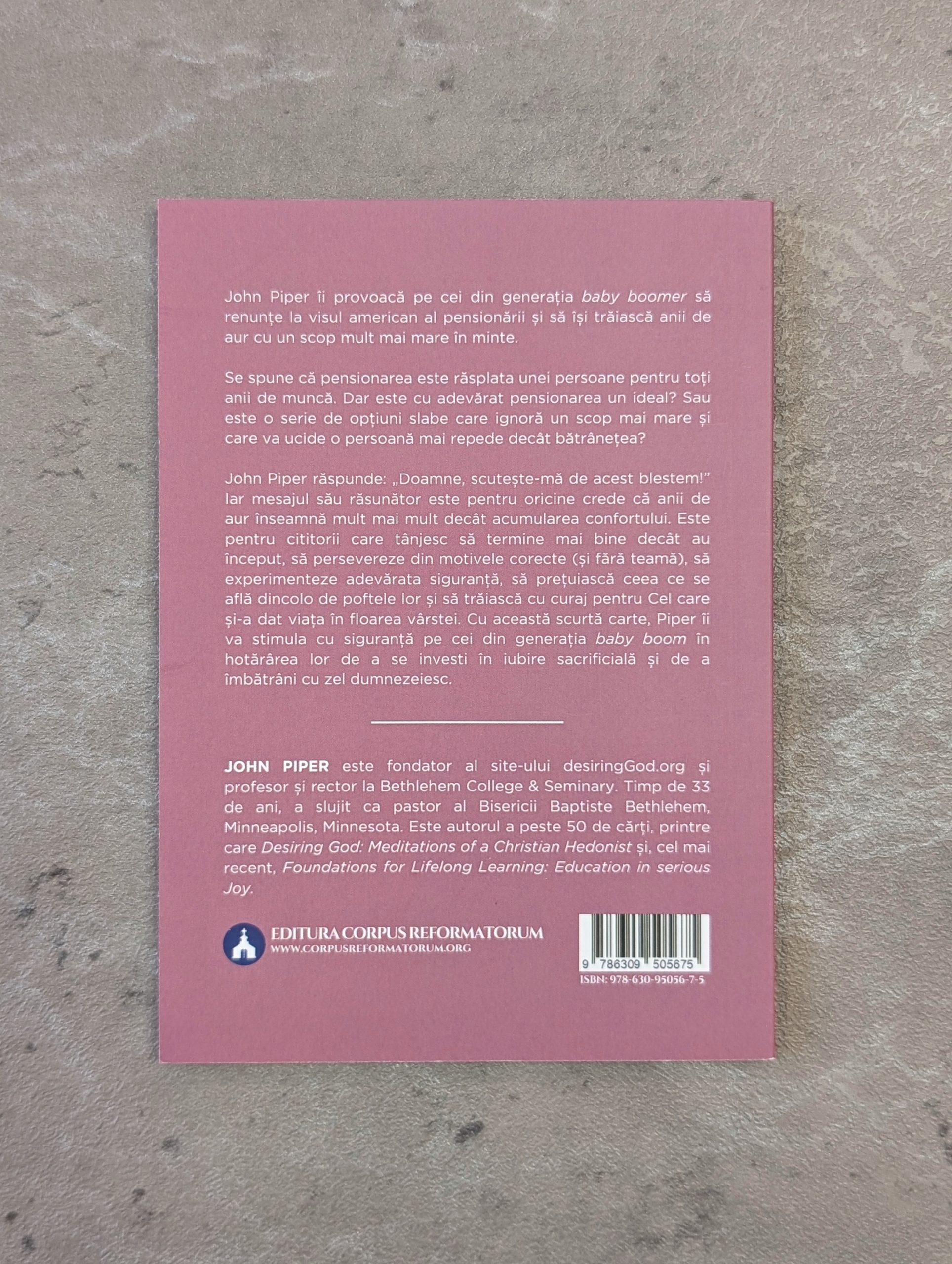 John Piper răspunde: „Doamne, cruță-mă din ghearele acestui blestem!” Iar mesajul său răsunător se adresează tuturor celor care cred că anii de aur înseamnă mult mai mult decât acumularea de confort. Este pentru cititorii care tânjesc să termine mai bine decât au început, să persevereze având în minte motivațiile corecte, să experimenteze adevărata siguranță, să prețuiască ceea ce se află dincolo de poftele lor și să trăiască curajos pentru Cel care și-a dat viața în floarea vârstei. Prin această scurtă carte, Piper dorește să-i stimuleze pe colegii din generația Baby Boomers în hotărârea lor de a-și investii viețile în sacrificiul iubirii – și de a îmbătrâni cu zel dumnezeiesc.
