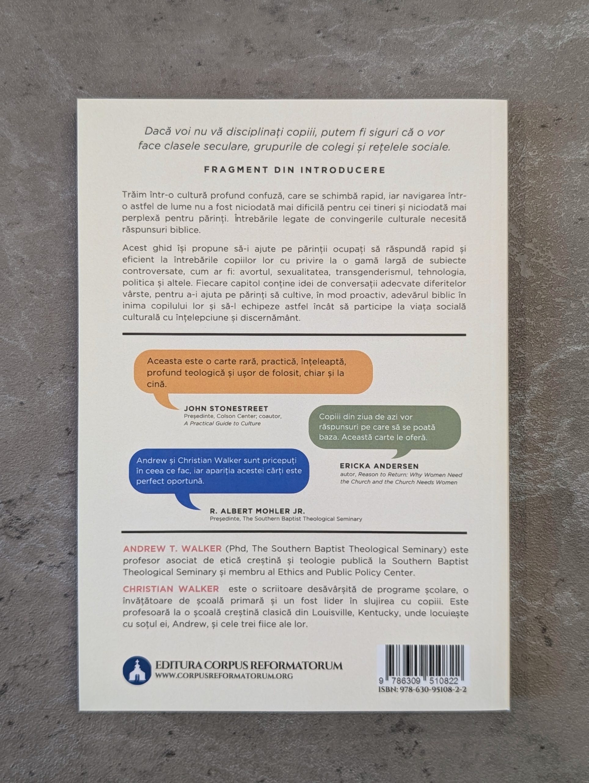 Acest ghid își propune să-i ajute pe părinții ocupați să răspundă rapid și eficient la întrebările copiilor lor cu privire la o gamă largă de subiecte controversate, cum ar fi: avortul, sexualitatea, transgenderismul, tehnologia, politica și altele. Fiecare capitol conține idei de conversații adecvate diferitelor vârste, pentru a-i ajuta pe părinți să cultive, în mod proactiv, adevărul biblic în inima copilului lor și să-l echipeze astfel încât să participe la viața socială culturală cu înțelepciune și discernământ.